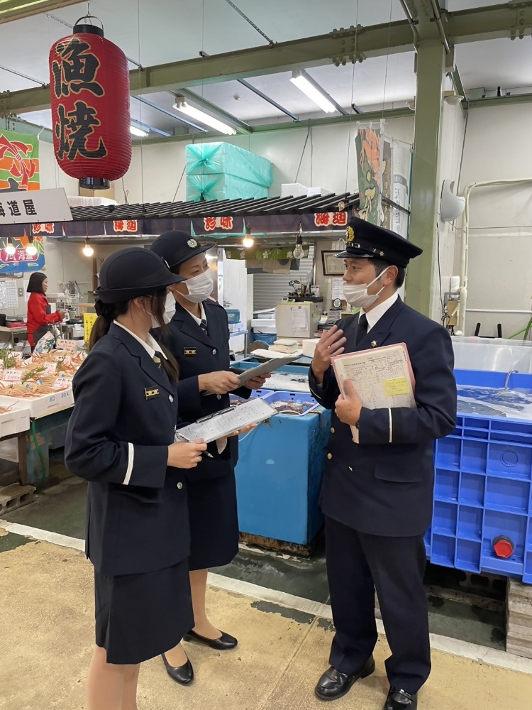 公開日: 2025年12月18日 12月18日に歳末特別火災予防警戒期間に合わせ『金沢港いきいき魚市』で防火パトロールを実施しました。 各店舗の火気使用設備の設置状況や使用状況を確認し、火災予防リーフレットを各店舗に配布しました。