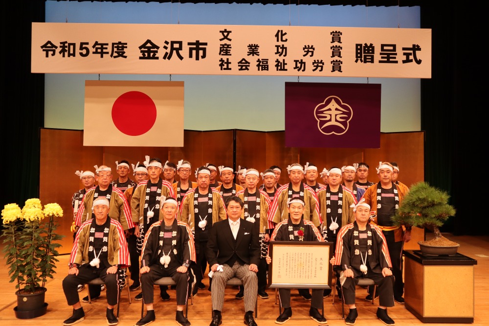 江戸時代の「大名火消し」加賀鳶の伝統技術を継承し、設立以来、技術伝承や後継者育成に取り組んでおり、毎年の消防出初式や金沢百万石まつりで勇壮な技を披露し、市民に親しまれているほか、国内外での演技活動を通じて文化交流にも貢献し、金沢市の伝統文化の継承と発展に大きく寄与した功績が讃えられ、金沢市文化章を受章しました。